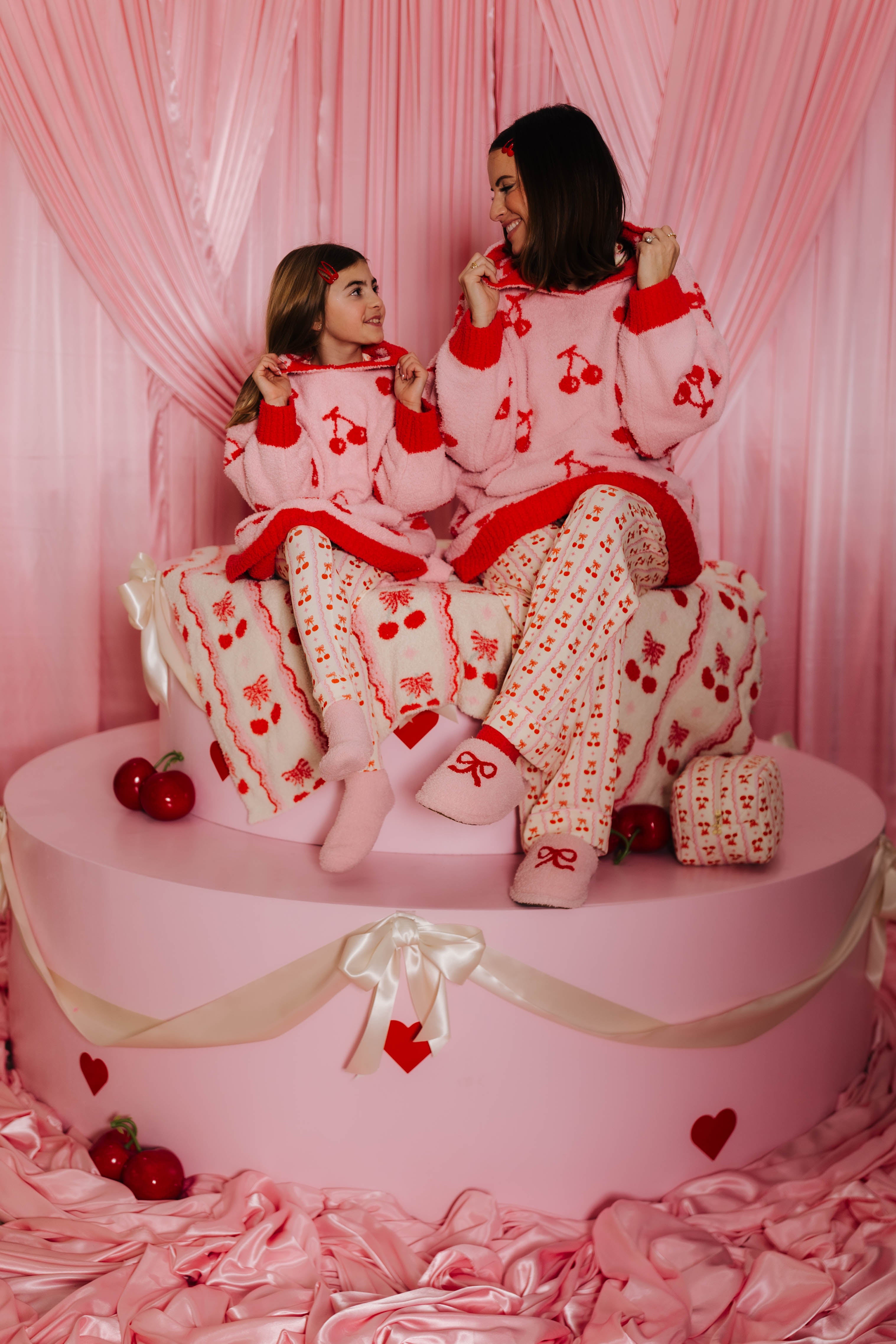 Hands-free comfort made easy 🍒 Our Cherry Wearable Blanket is designed for staying warm while still being able to move around comfortably. Made from our signature ultra-soft cozy knit, it features an oversized fit, a soft hood, and a roomy front pocket. Perfect for lounging at home, movie nights, or chilly mornings.