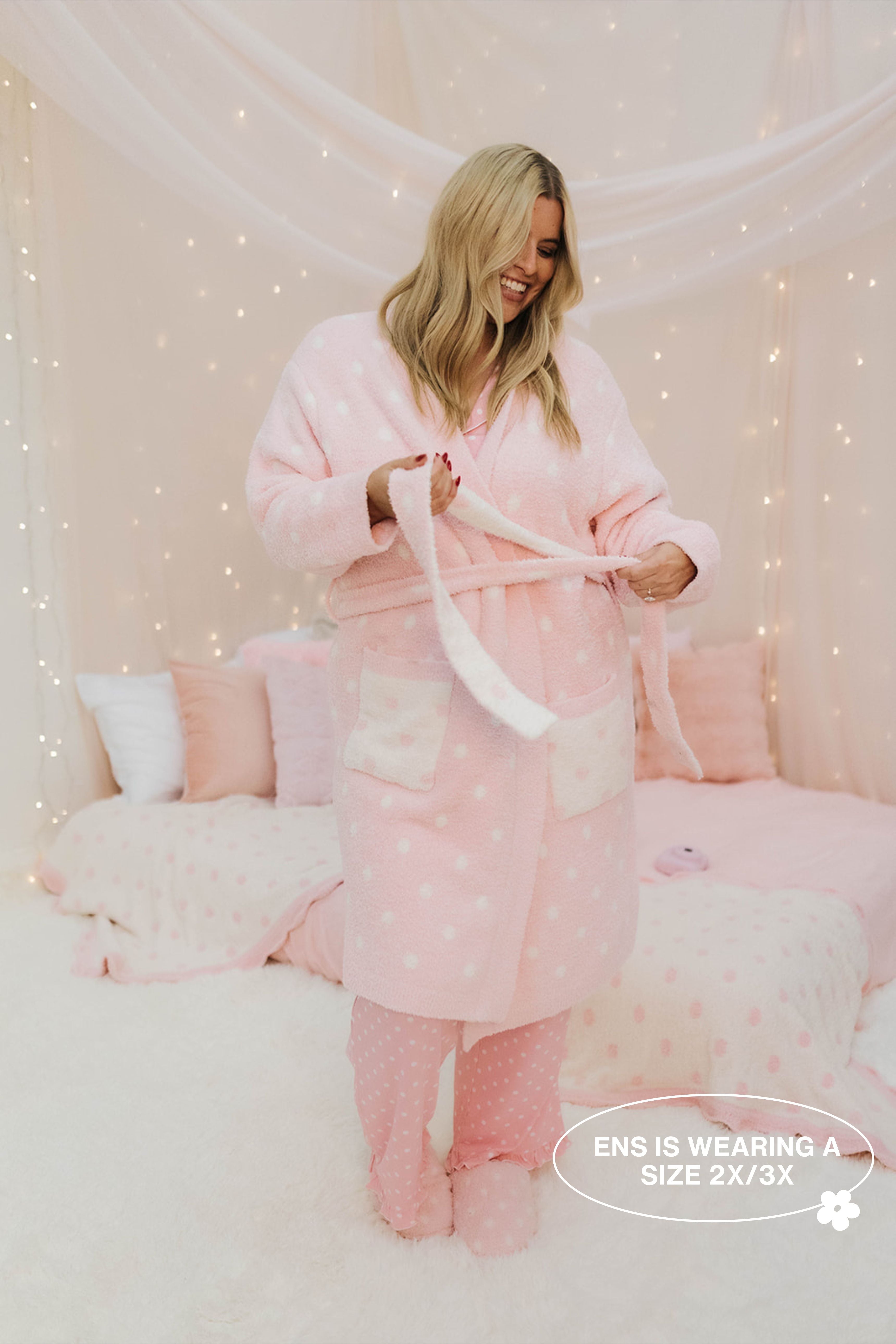 Our fluffy pink polka dot robe is cloud-soft, warm, and made for lounging. The relaxed, drapey fit wraps you in all-day comfort, and the outer ties keep everything secure while you sip coffee, get ready for the day, or unwind in full cozy mode. Designed for slow mornings, self-care nights, and matching moments with your favorite Staykation pieces.