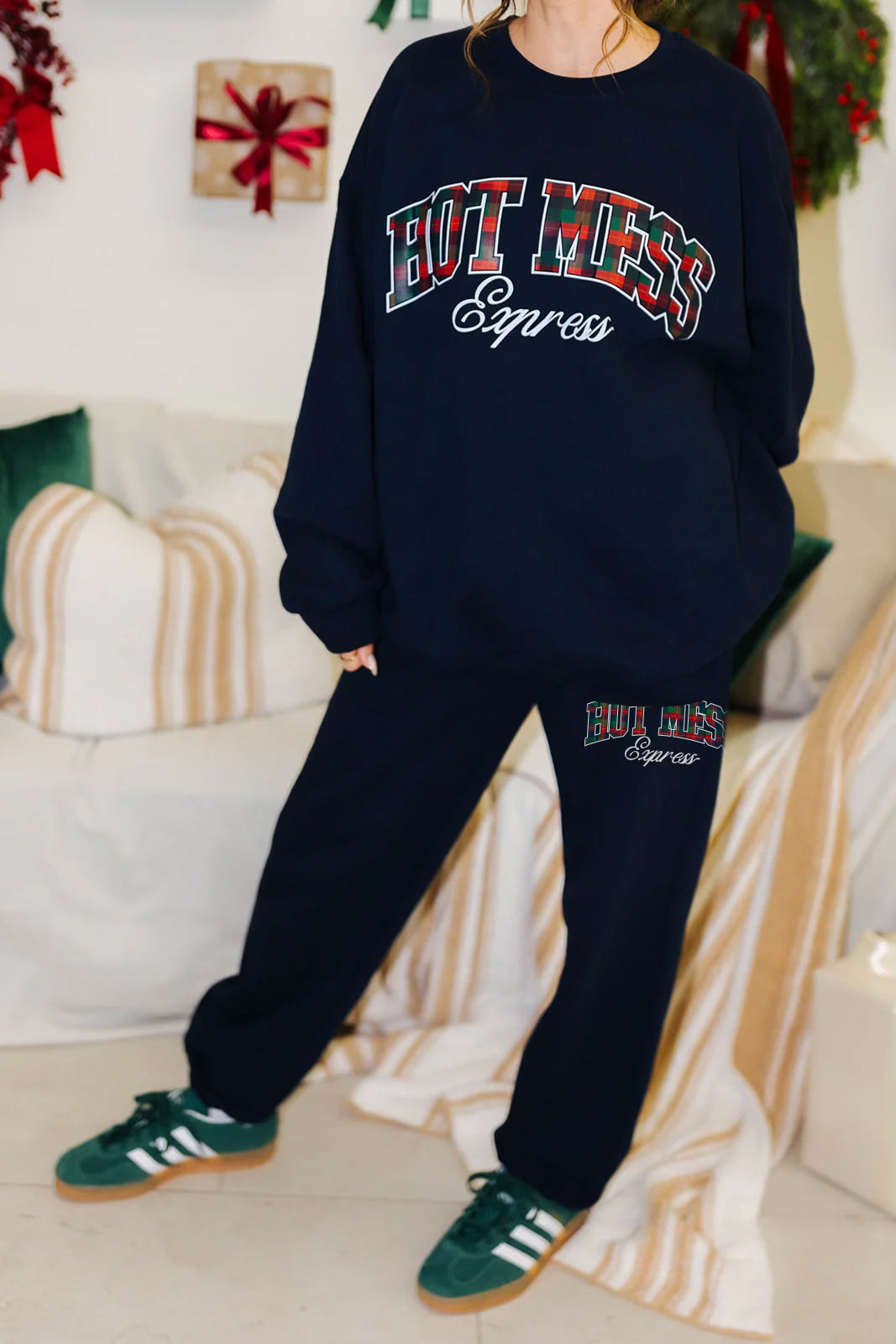 The color is navy with plaid lettering detail on the side of the leg that says "Hot Mess Express" to match the sweatshirt. Slight color variations may occur due to the printing process.